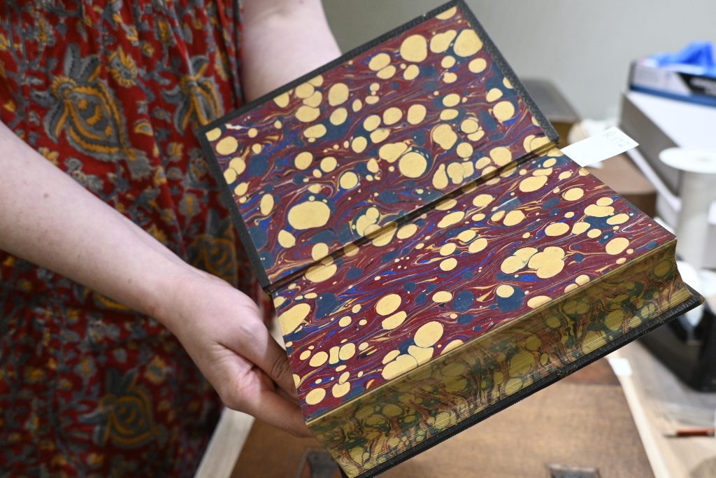 This gilt-tooled goatskin binding was produced in the workshop of Samuel Mearne, bookbinder to King Charles II. Its detailed gold tooling, colourful end-papers, and decorative spine reflect the highest standard of Restoration-era craftsmanship. The volume illustrates how printing and binding operated as separate skills, with buyers choosing the quality of binding they desired.
