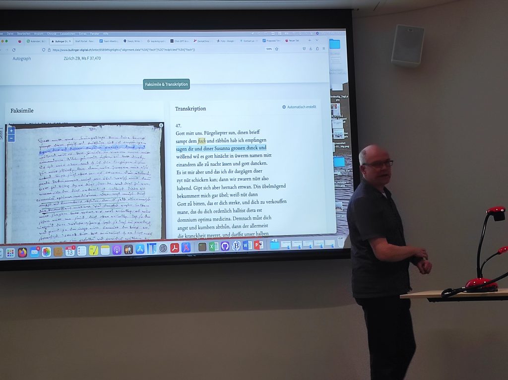 In recent years, Prof. Dr Martin Volk and his team have digitized many of these letters, making them easily accessible with just a mouse click. On February 24, 2023, to celebrate the 500th anniversary of the first letter of the HBBW, Prof Volk shared the impressive results achieved by his team using computer linguistic tools. The presentation can be viewed here: https://www.bullinger-digital.ch/downloads/Bullinger_digital_ZB_2021_11_03.pdf
