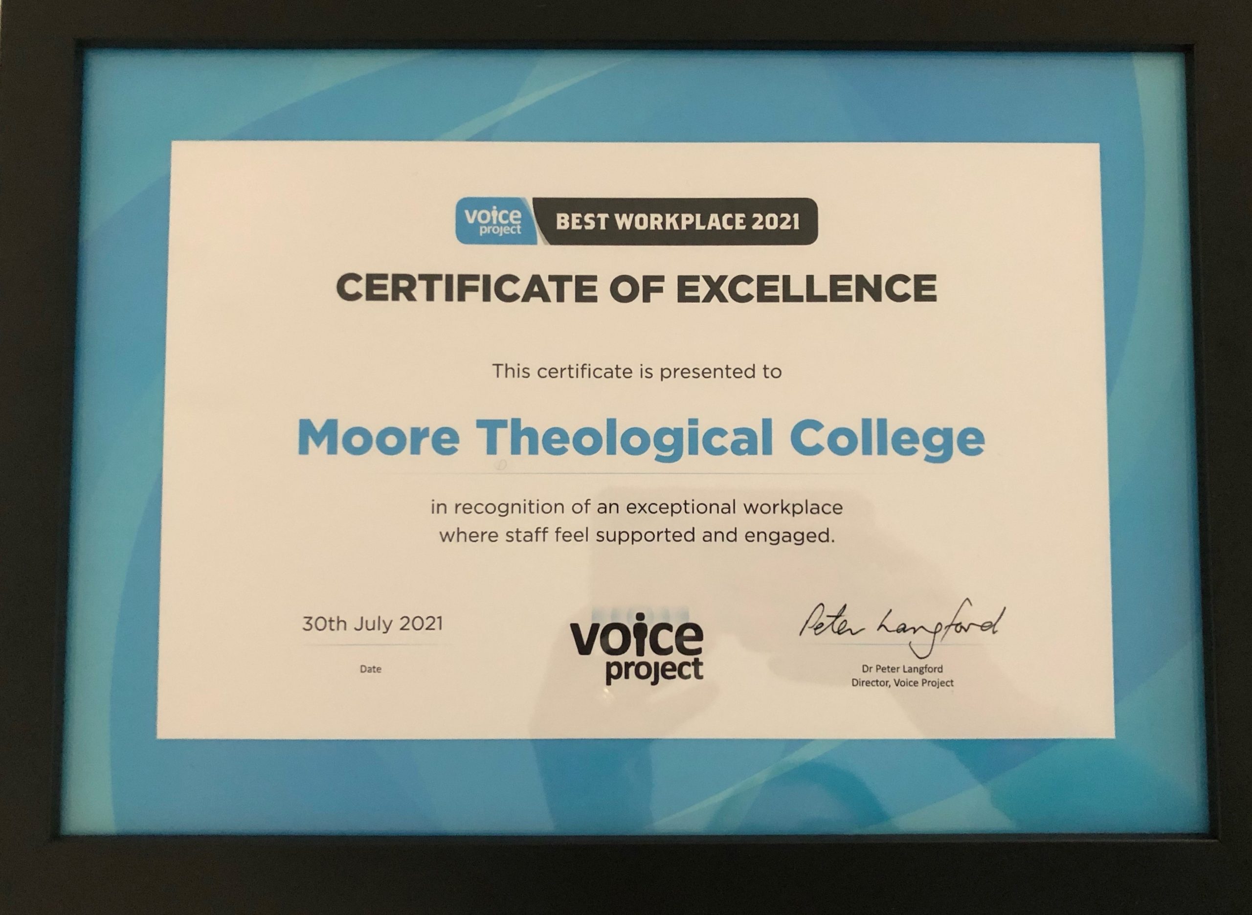 Moore Theological College has been recently awarded the Voice Project’s Best Workplace Awards for 2021. This prestigious award recognises best workplaces who have excellent management practices and a highly engaged workforce. Our faculty and staff report exceptional levels of engagement and satisfaction in our latest staff survey. Specifically, we exceeded both the university benchmark and other tertiary institutions by more than ten percentage points.