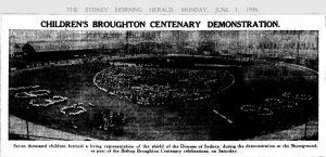 The depth and scope of Bishop Broughton’s work was keenly felt by his later successor, Archbishop of Sydney H.W.K. Mowll and his wife Dorothy. They organised a series of celebrations from May 24th to June 7th 1936, in honour of the centenary of Broughton’s enthronement, including several services in St Andrew’s Cathedral which combined the celebrations usually held for Empire Day. 7000 Sunday School children filled the Sydney Showground, and various youth organisations held a demonstration with banners in the Town Hall. A historical pageant, performances by the Centenary Choir, a garden party at the King’s School and a missionary exhibition featuring Bishops from India, Palestine and Japan, were also held. The events attracted visitors from across Australia, and received wide press coverage. In the depths of the Depression, with war on the horizon, the celebrations united the diocese in remembering and rejoicing in Australia’s Christian heritage.