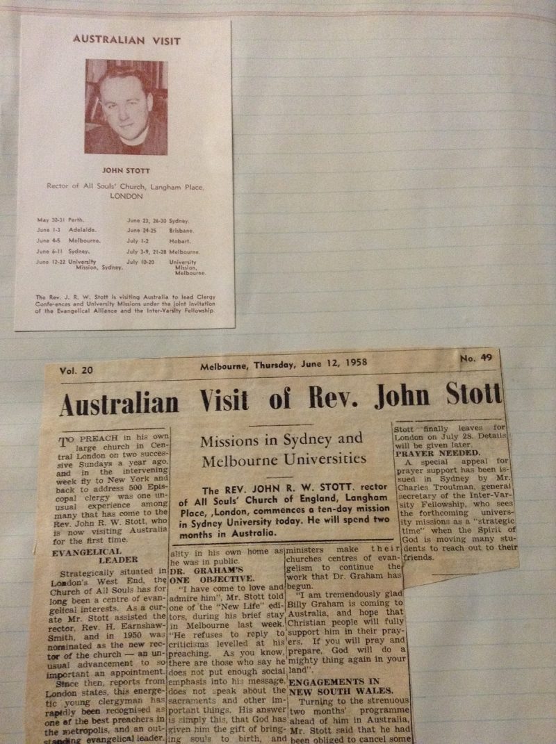 In 1958, John Stott, then Rector of All Souls Langham Place, came to Australia and conducted missions at Sydney and Melbourne Universities. At this time, the IVF was also gearing up for one of the largest evangelistic events ever held in Australia – the 1959 Billy Graham crusade.