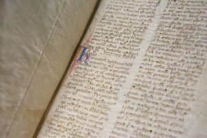 It is a portion of Gregory the Great’s Epistles, and the handwriting has been identified as being a fourteenth century English court or business hand*. The large capital, finished with red and blue ink, is known as a rubricated capital. Many early printed books also feature illuminated or rubricated capitals finished by hand.