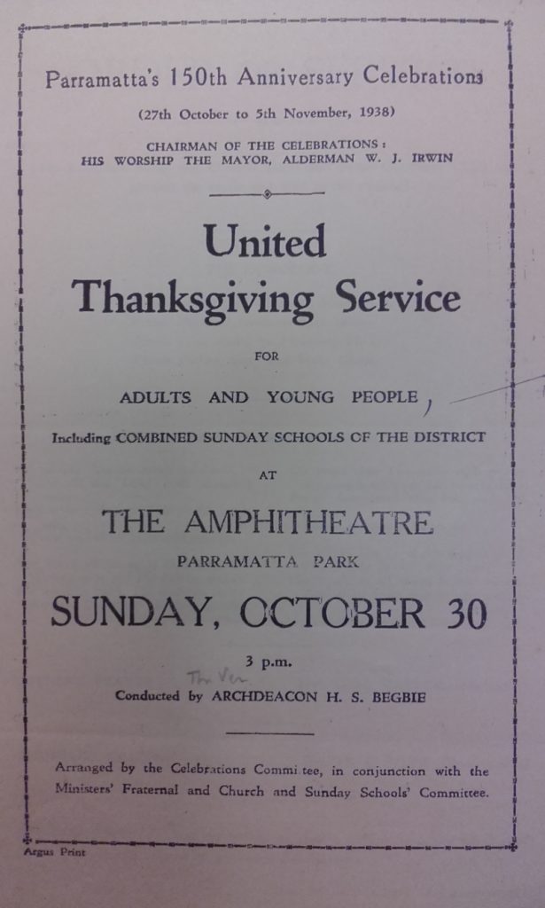 In 1938, the municipality of Parramatta celebrated its 150th anniversary, in conjunction with nation-wide festivities for the sesquicentenary of European settlement. Events included a parade with floats, a circus, fireworks, and a “Day of Witness” on Sunday 30th October – an ecumenical church service in Parramatta Park, preceded by a procession of the combined Sunday Schools of the district. R.T. Pearson was invited to assist with organising this event. The British and Foreign Bible Society provided a float to join the procession.