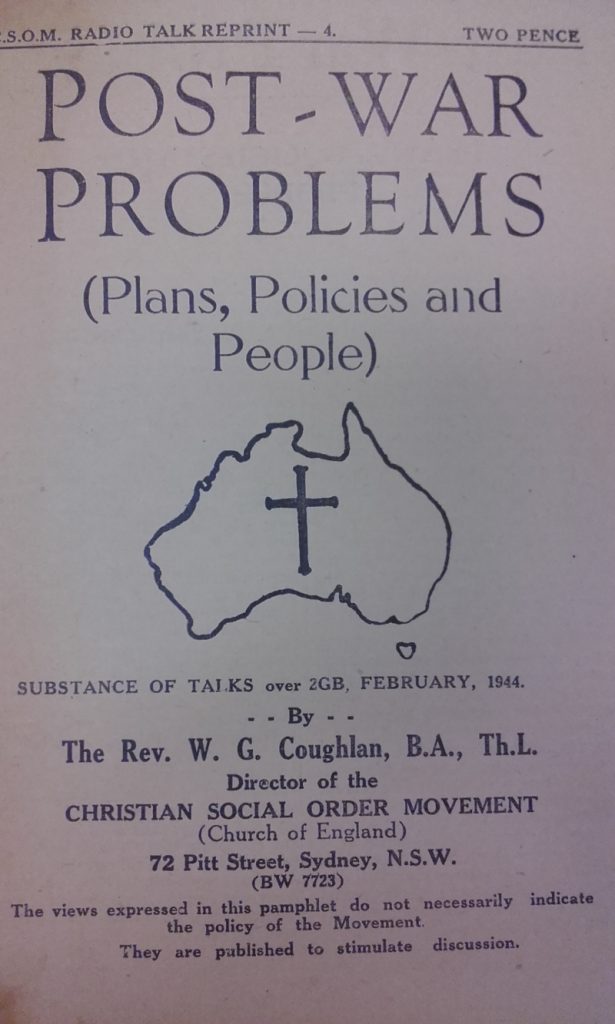 A unique sub-collection is a file of records relating to the Christian Social Order Movement. Established in 1943 and operating until around 1951, the movement was chaired by the Bishop of Armidale J.S. Moyes, and was intended to supplement the Social Questions Committee of the General Synod. A monthly magazine The New Day was produced, featuring articles on various social issues. Arising from the era of post-war reconstruction, the movement did not survive the anti-communist attitudes of the 1950s. Bishop Moyes and his contemporary Bishop of Canberra and Goulburn Ernest Burgmann, who was also involved in the CSOM, both openly opposed Sir Robert Menzies attempt to ban the Communist Party of Australia in 1951.