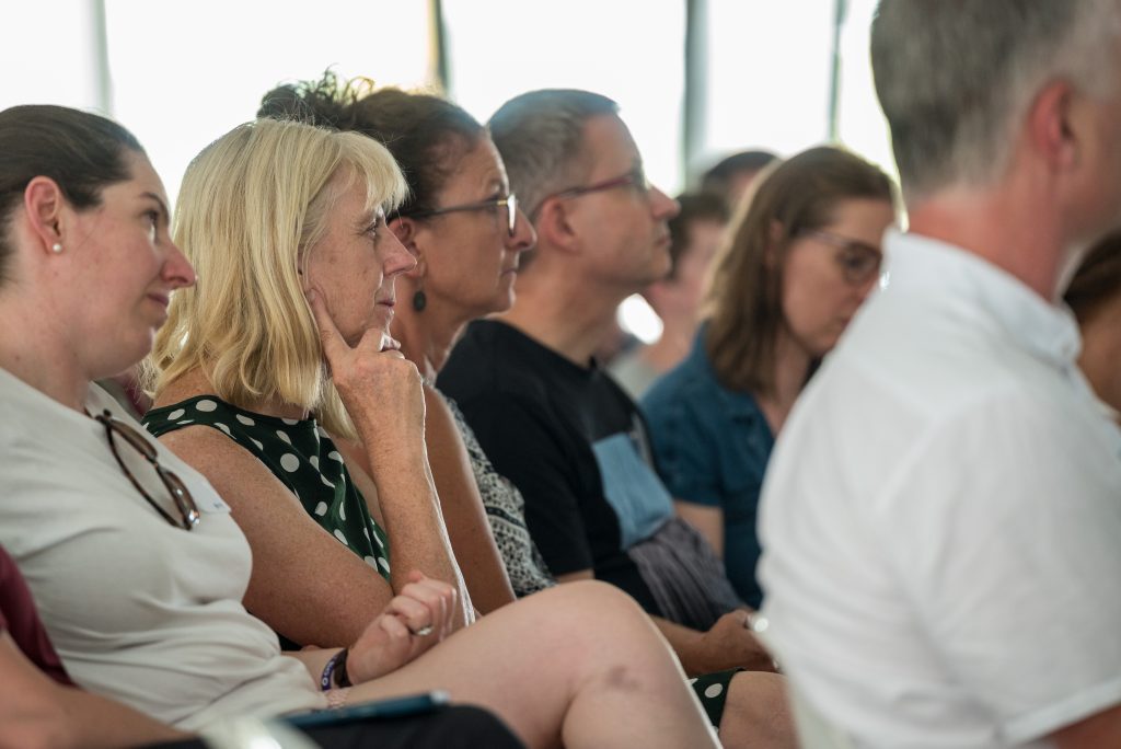 Alumni were invited to stand — and remain standing — as different Principals were named, visually marking the many eras represented in the room and the breadth of the Moore community across generations.